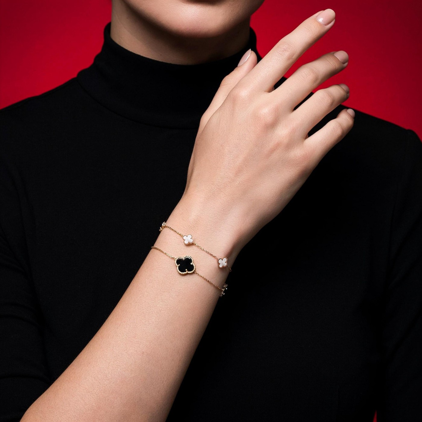 Izuzetna narukvica u žutom zlatu sa sedefom i oniksom. Model koji prati svetske modne trendove, idealna u kompletu sa mindjušama, ogrlicom i prstenom.